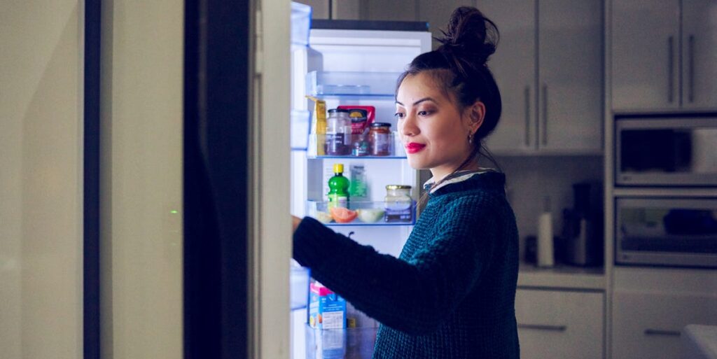 “I generally eat dinner with the kids around 6 p.m., so I made sure that we were all done by our 7 p.m. cutoff,” says Judy Koutsky, a writer who went on a mission to curb late-night eating for a whole month. “Instead of a more vague, ‘no snacking before bed,’ a hard rule of ‘no food after 7 p.m.’ was actually easier to follow because it was so rigid.” Your cutoff time may be earlier or later depending on your schedule, but it’s still helpful to have one in mind.