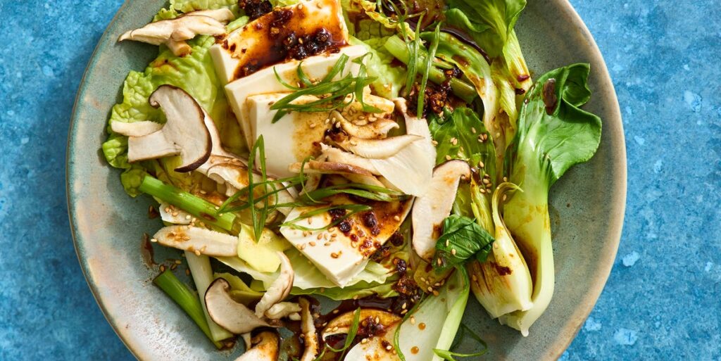 - Step 2Place garlic, ginger, and scallion whites and light greens on cabbage leaves. Divide tofu and shiitakes among leaves, then transfer parcels to steamer basket (lining it with cabbage leaves will keep tofu from sticking). Nestle bok choy around cabbage parcels. Bring water to a boil, then reduce heat to a simmer. Cover; steam until tofu is warmed and vegetables are tender, 11 to 12 minutes.