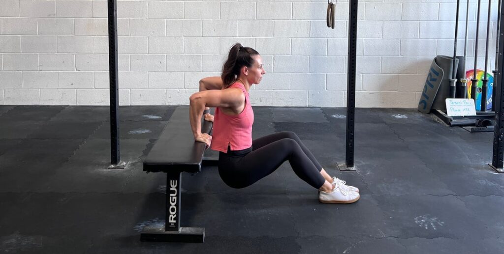 trainer in gym doing chair dips on bench